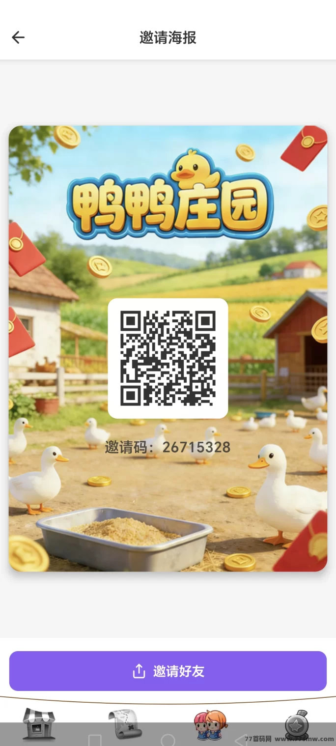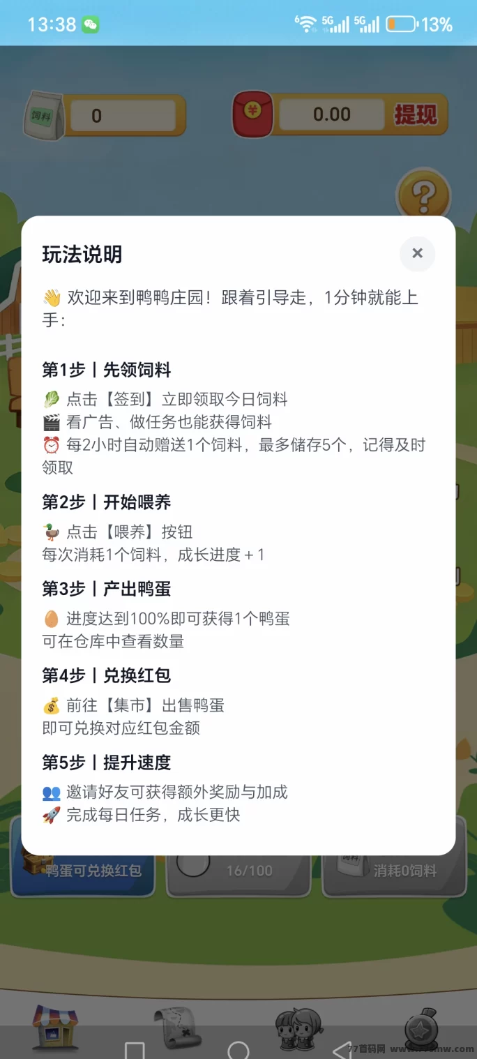 鸭鸭庄园上线,玩家可以完全免费养鸭子,每个鸭蛋可直接兑换10圆,提取稳定快速。每天签到就能领虹包,看广告和邀好友也能获得饲料奖励,好友看广告你还能躺赚饲料。把饲料喂给鸭子,它们就会产蛋,鸭蛋直接变现,零投入轻松赚米。